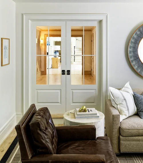 A custom glazed cabinet finish brought the previously country-feeling kitchen in line with the more modern feel of the rest of the house. New pendant lights and a light, stone backsplash accent, but do not deter from the sweeping views of the lake outside the corner window.