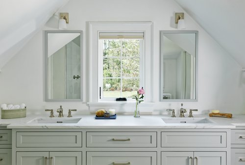 Once a dated master bathroom with a sunken tub, we converted it to an open, bright, modern, and spa-like bathroom with a full renovation. The vanity with a pair of custom, floating mirrors allows the clients to catch a glimpse of the lake beyond the mirrors. A stand-alone, soaking tub is nestled on the lake side of the bathroom surrounded by floor to ceiling windows. A unique design feature of a wall-to-wall storage niche accents the large walk-in shower.